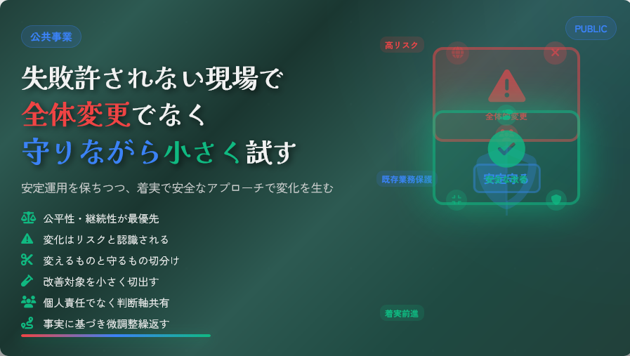 公共事業や行政の現場では、公平性や継続性、そして失敗が許されない「安定運用」が何よりも重視されます 。こうした環境下で、民間企業のような「問題解決アレルギー」を回避し、いかに安全に改善を進めるべきか。本日は、変化をリスクと捉えがちな現場を守りながら、一歩前に進めるための視点をお伝えします 。