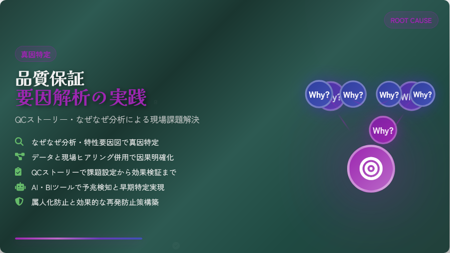 要因解析は品質保証の基盤であり、QCストーリーとPDCAを強化する重要な工程です。現場で発生する不具合や課題を「なぜなぜ分析」「特性要因図」「パレート図」など多角的に掘り下げ、根本原因を科学的に特定することで属人化防止と効果的な再発防止策に繋がります。