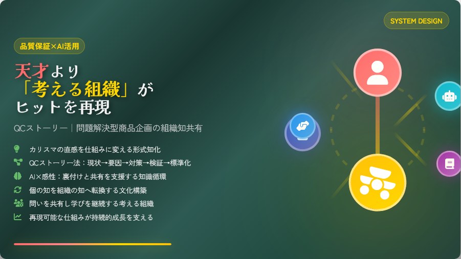QCストーリーとAIの融合で、感性×論理の双方を備えた商品企画・品質保証体制を構築し、組織が自ら考え続ける文化を育てましょう。