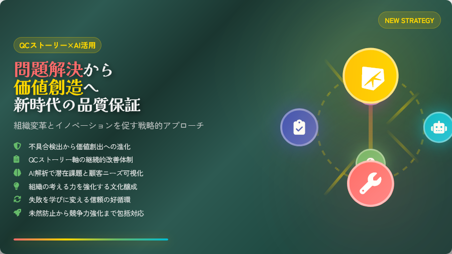 QCストーリーを軸に据え、AI技術を活用したデータ解析により、問題の未然防止だけでなく、潜在的な課題や顧客ニーズを科学的に見極め、製品企画や開発に反映する体制づくりが不可欠です。
