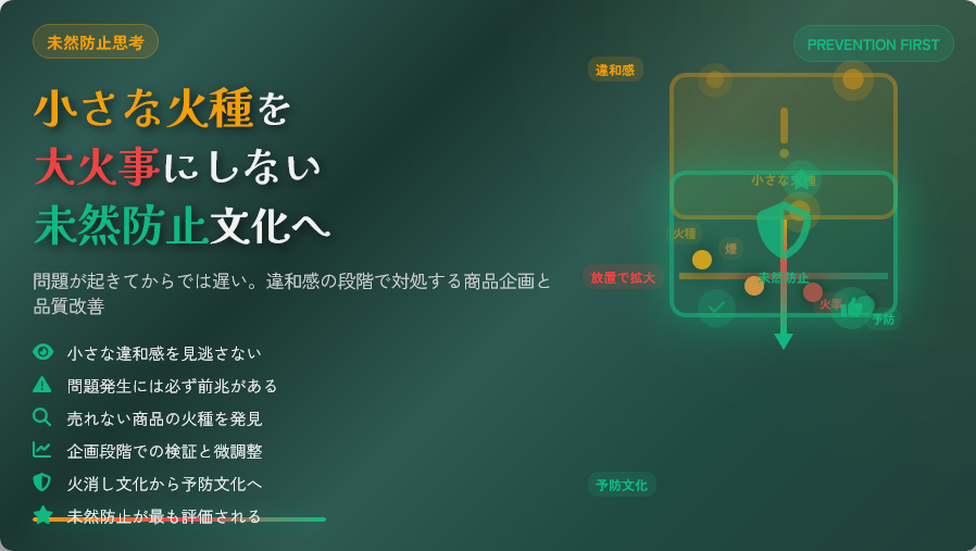 商品企画の文脈では、発売前の企画段階での気づき、企画機能の微調整、顧客検証による市場適合性の確認などが「未然防止の火消し」に相当します。 売れなくなってから原因分析・広告強化・値引き・在庫圧縮に走るのではなく、企画段階での微調整と検証によって大事故化を防ぐことが重要だとまとめられています。