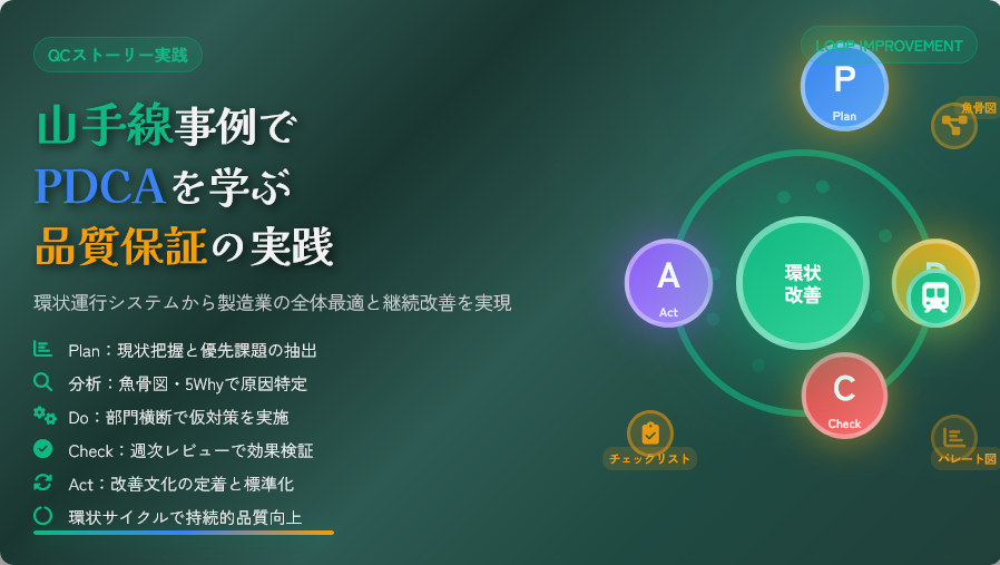 製造業B2Bの品質保証責任者・現場リーダーは、QCストーリー/PDCAの回転遅延、部門間壁、データ活用不足に悩まされます。属人化や前例主義が品質課題を慢性化させ、顧客視点が欠如しています。本記事では、山手線運行事例(29駅、34.5km環状線)を基に、製造業に応用可能なQCストーリー手法を解説。現場即実践ステップで組織改善を実現します 。