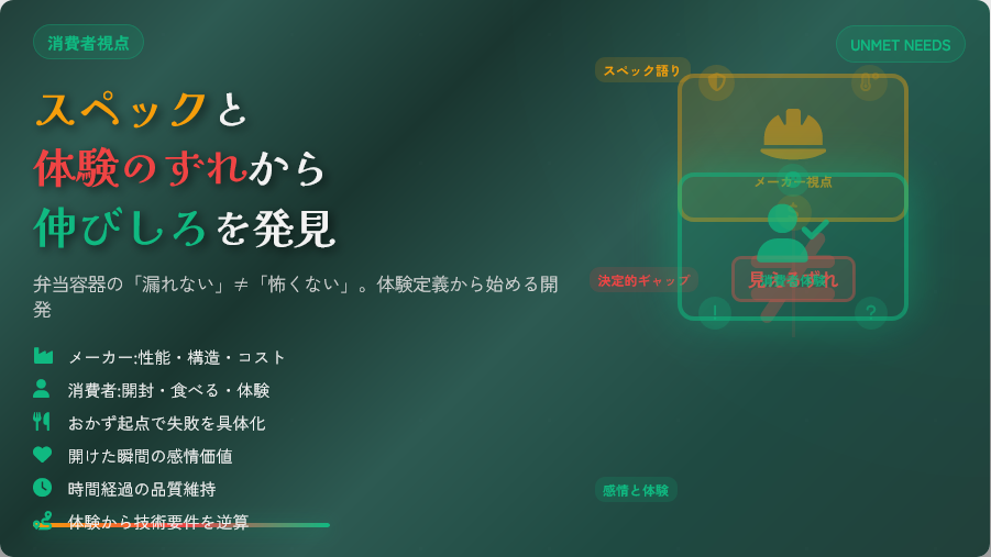 弁当容器は「漏れない・壊れない・電子レンジ対応」といった機能が当たり前になり、一見すると差別化の余地がない成熟領域に見えます。 しかし、実際に弁当を買って食べる側の体験に目を向けると、「開けるのが怖い」「こぼれるのが不安」といった未充足ニーズがまだ多く残っています。