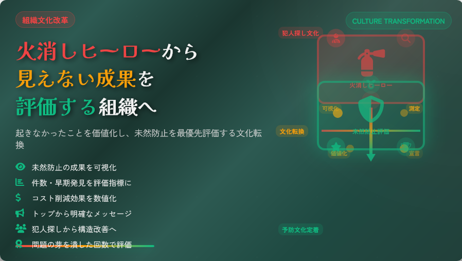組織の評価は「目に見える結果」に偏りがちであり、経営が明確に意図しない限り、未然防止のような地味な活動は評価対象から外されやすいと説明されています。 その結果、「問題が起きなかったこと」ではなく、「問題が起きた後にどう対処したか」ばかりが注目される構造が生まれます。
