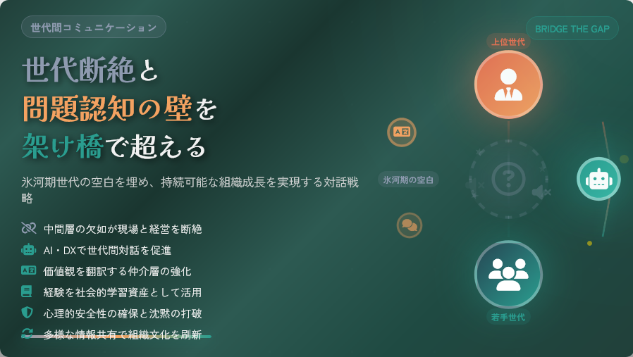 世代間の価値観や働き方の違い、ミドルマネジメント層の空白が組織の情報伝達や意思決定に影響し、変革の停滞や組織力低下を招く現状を掘り下げ、AIやDXを活用したスムーズな世代間対話と社会的学習遺産の活用を提案します。