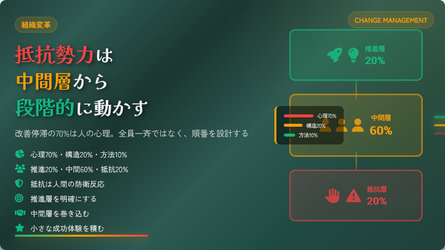 どの組織にも、変化を推進する少数の指示者、周囲を見て態度を決める多数の中間層、変化を避けたい抵抗勢力が存在します。 数値は組織によって異なりますが、イメージとしては「推進層20%前後/中間層60%前後/抵抗層20%前後」と整理されています。