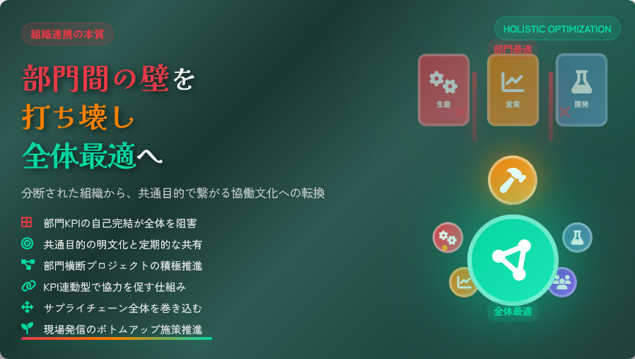 各部門が自部署のKPI・最適化ばかりを追い求めることで、情報共有や協力が希薄となり、全体の価値創造が妨げられてしまう現状を現場視点から明らかにしています。