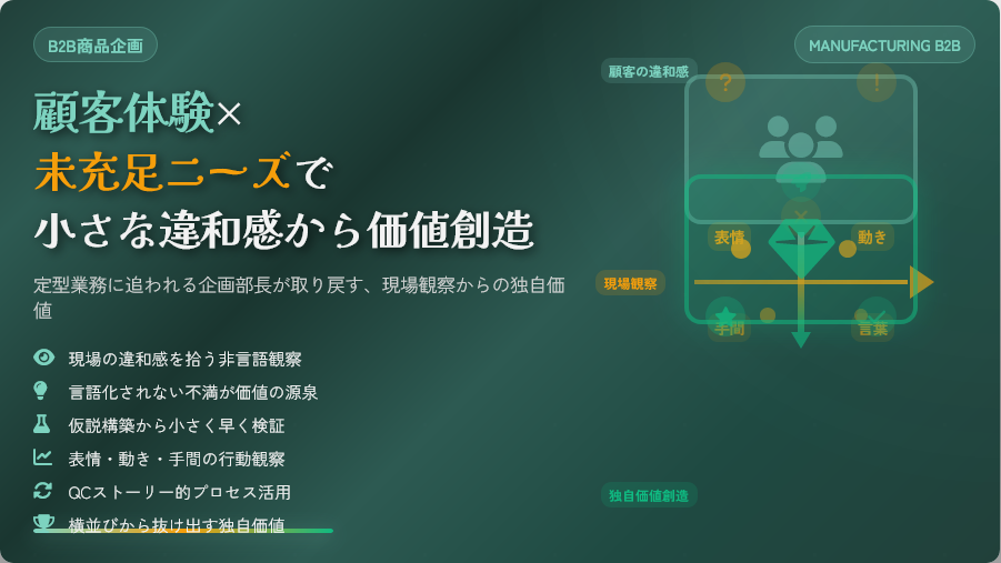 現場で拾うべき違和感は、技術的な高度さではなく「顧客がなぜモヤモヤしているか」という感覚に根ざしたものです。 この小さな違和感を集めていくことが、競争優位となる独自価値の出発点になると指摘されています。