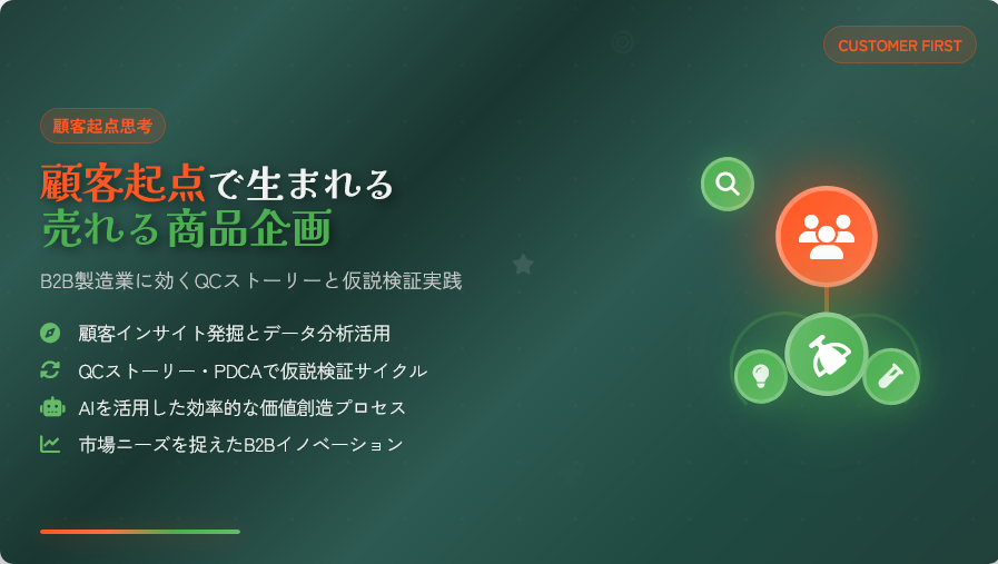 製造業・B2B企業の企画・マーケティング担当者向けに「顧客視点」を核とした売れる商品企画のフレームワークを解説します。QCストーリーやPDCAを用いた業務改善、顧客インサイトの発掘、AIを活用した効率的な仮説検証プロセス、データ分析による価値創造など、現場ですぐ使える実践ノウハウをまとめています。